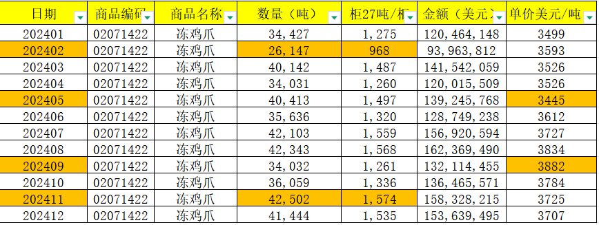按照中国海关总署数据显示,做为国内冻鸡爪进口范畴的主要参取者,9月达全年最高3882美元/吨,